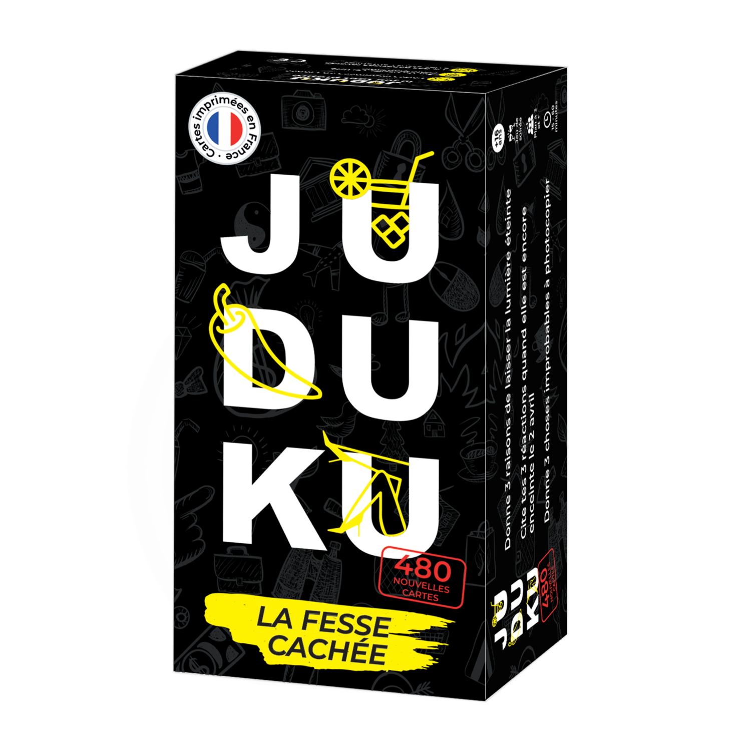 JUDUKU : la Fesse Cachée, c’est 480 nouvelles cartes pleines d’humour noir pour pimenter tes soirées et révéler les pires pensées de tes ami(e)s C’est aussi des nouvelles cartes spéciales avec des gages délirants et des nouveaux mode de jeux Dans ce jeu, les joueurs doivent, en 8 secondes seulement, répondre à des questions du type :